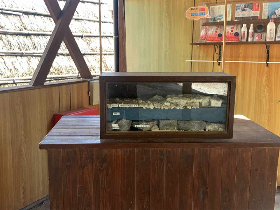 明礬エリアで取れる湯の花という石。明礬エリアの硫黄臭はこの湯の花が放っています。